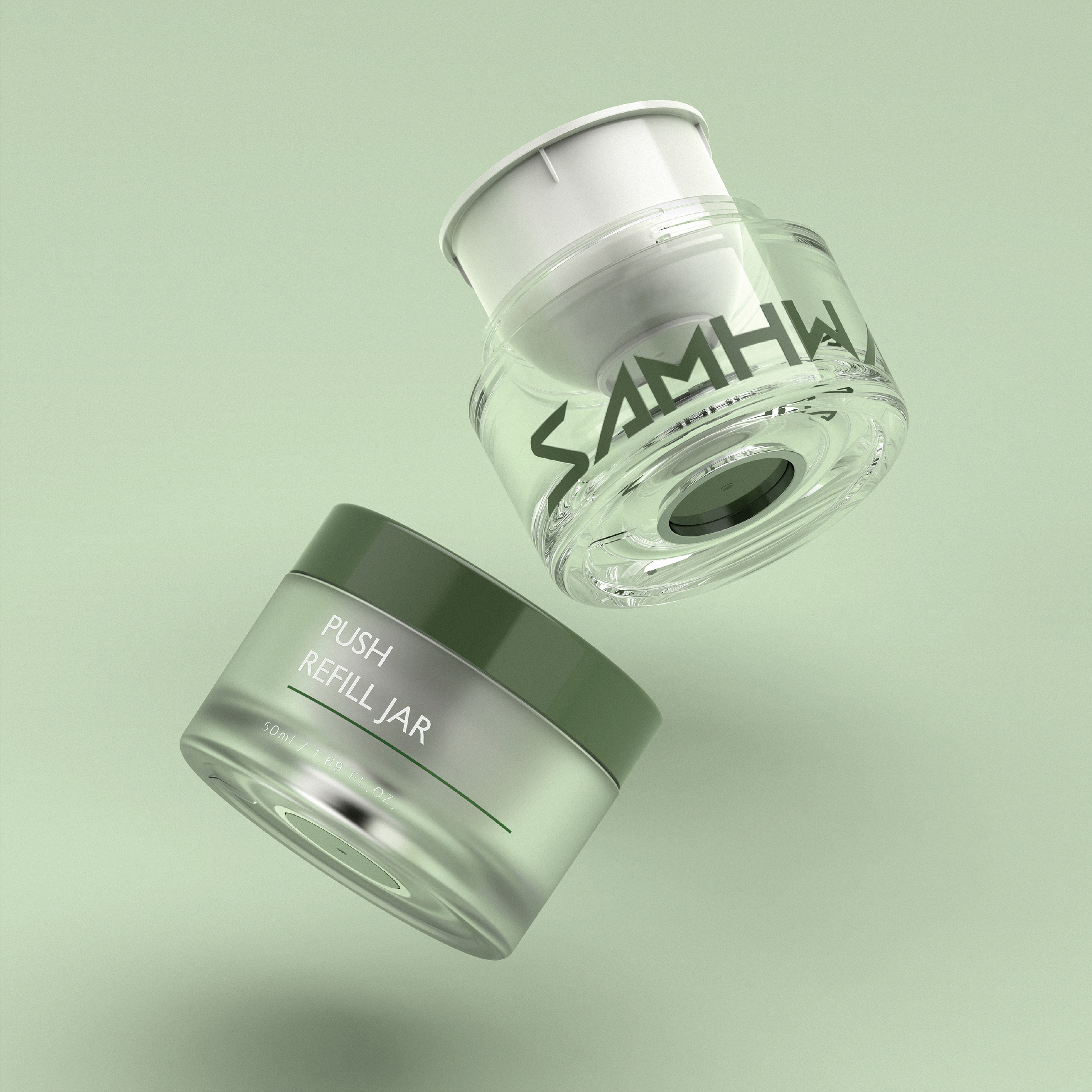 세상 쉬운 리필이 가능한 친환경 크림 용기 - 쉬운 리필을 위한 하단 PUSH 버튼 - 버려지는 부품 최소화, 진정한 친환경 리필용기 - PCR 소재 100% 적용가능