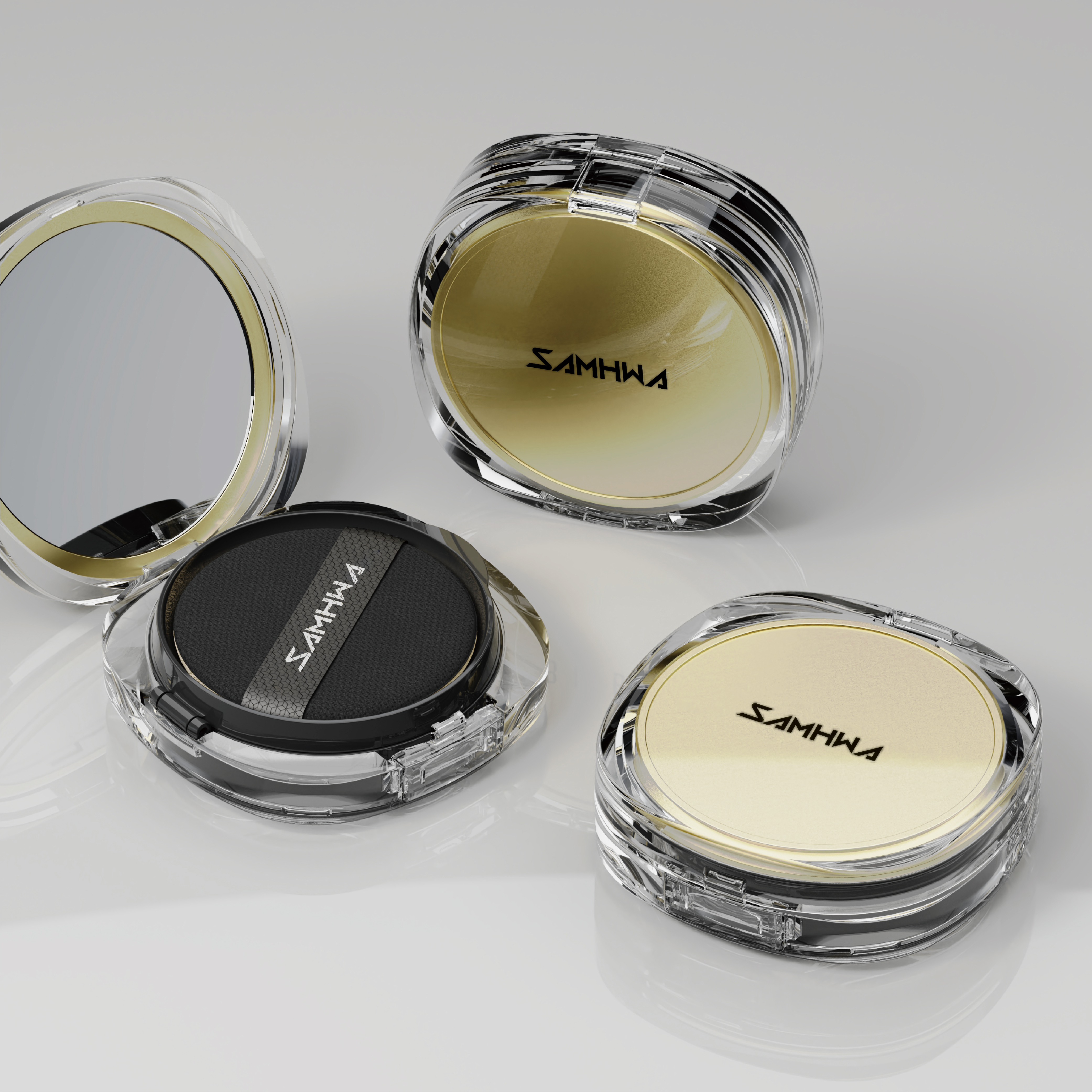 스웰링 현상 개선 & 깊은 투명감의 PET 쿠션 - ALL PET 소재 적용으로 PP 스웰링 이슈 해결 (친환경 PCR-PET 적용가능) - 밀폐력을 위한 내용기 이중사출 기술 - 부품 및 구조 최소화로 깊은 투명감 표현 - 상케이스 & 거울가이드 이중 데코 효과
